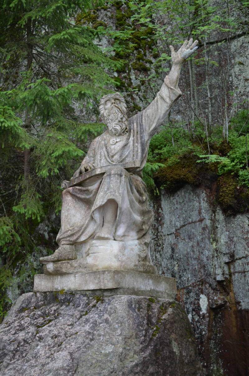 Monrepos-puiston tunnetuin yksityiskohta lienee Väinämöisen patsas. Ensimmäinen pystytettiin vuonna 1831. Menneitten lähes kahden vuosisadan aikana patsas on ehtinyt kokea kaikenlaista, vandalismista todelliseen sotaan saakka. Vasemmalla oleva kuva esittää kolmatta versiota, vuonna 2007 pystytettyä venäläisen kuvanveistäjän luomusta, joka suuresti muistuttaa Johannes Takasen vuonna 1873 veistämää kannelta soittavaa ja laulavaa Väinämöistä.