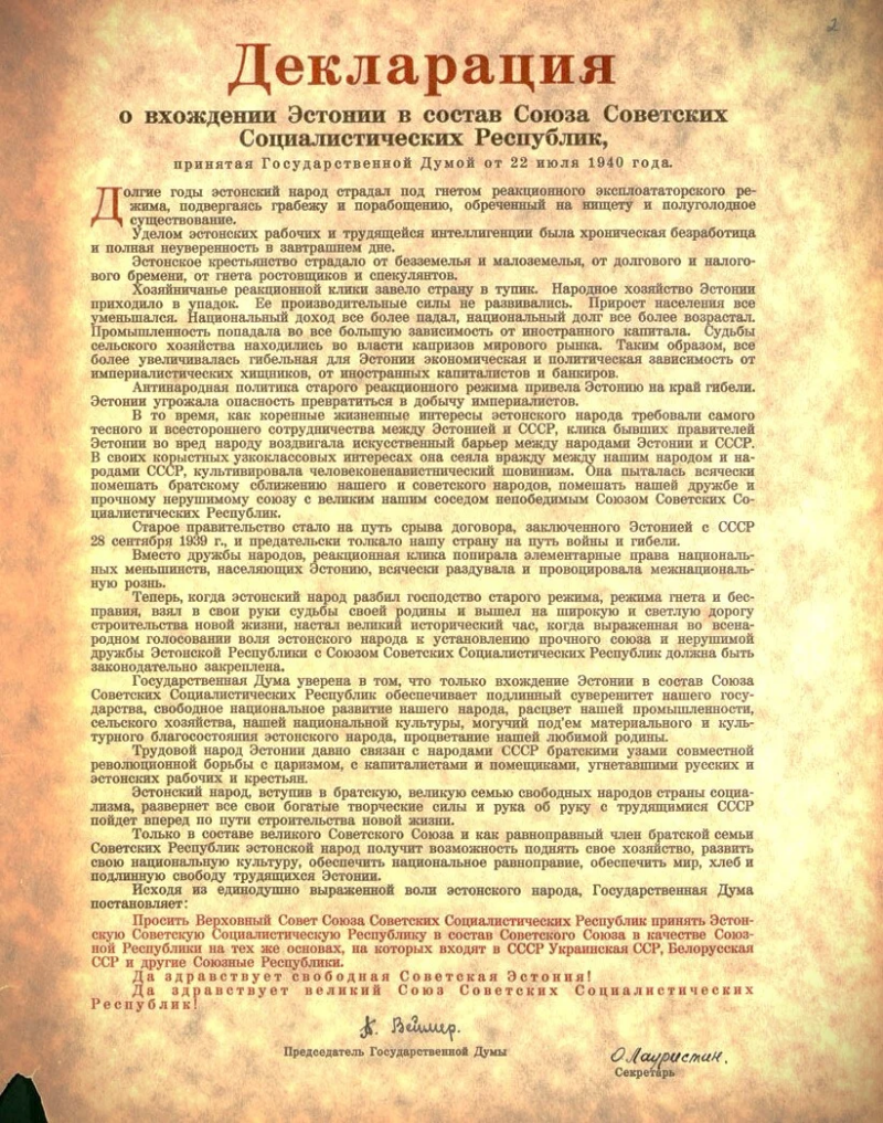 Nyt kun Eestin kansa on tuhonnut entisten sortajiensa ja oikeudettomien vallanpitäjiensä ylivallan, ottanut omiin käsiinsä syntymämaansa kohtalon ja lähtenyt etenemään uuden elämän rakentamisen leveää ja valoisaa tietä, on koittanut tärkeä historiallinen hetki, jolloin koko Eestin kansan äänestyksessä on käynyt selväksi perustaa Eestin tasavallan ja Neuvostoliiton välille luja, rikkoutumaton ystävyys, joka tulee lailla vahvistaa.”